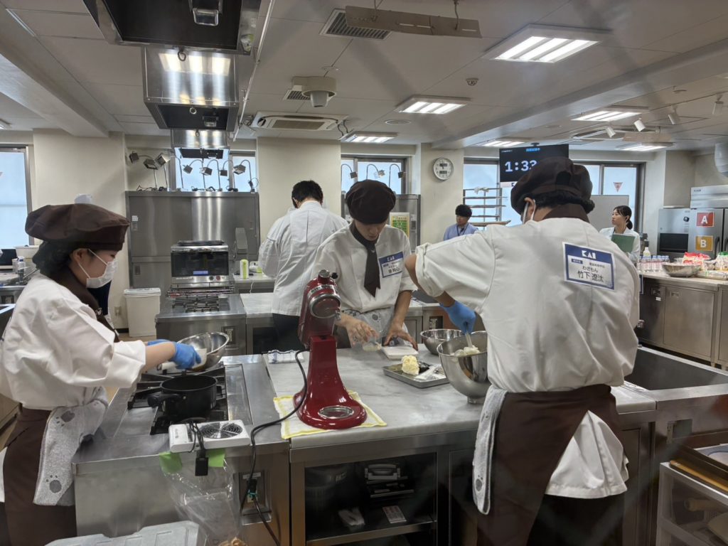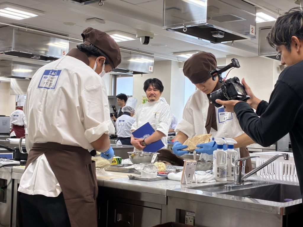 会場となった東京ベルエポック製菓調理専門学校では、最初は緊張した面持ちでしたが、声を掛け合ううちにいつもの練習のような雰囲気を取り戻し、これまでの練習の成果を存分に発揮しました。顧問の梅本先生と外部講師の北川先生も、頼もしい姿に目を細めていました。