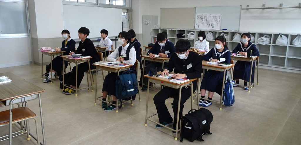 「・・・高校での最初の授業に臨みました!」・・・井上先生の「数学」の授業です。一人一人が出身中学校の制服・・・何とも初々しい限りです。それぞれの将来に繋げるための今日です。3年後を見据えた高校での初日が始まりました!