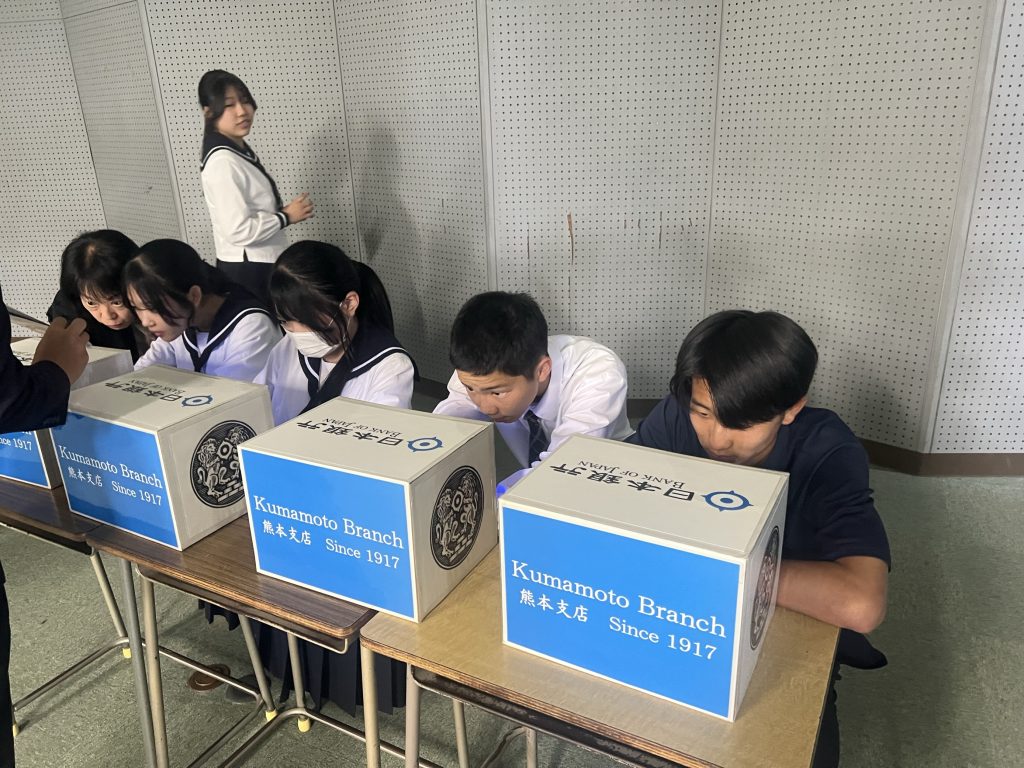 5/14(水)5,6時間目2年生のグローバルコースで行われた日本文化理解の授業では、日本銀行熊本支店より3名の講師の先生方をお迎えして、日本銀行の役割や新札の偽造防止について学びました!