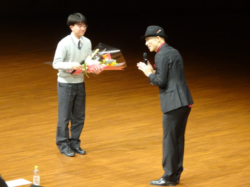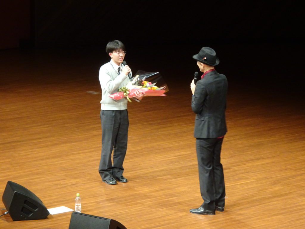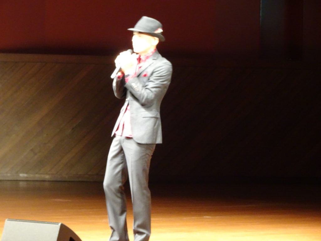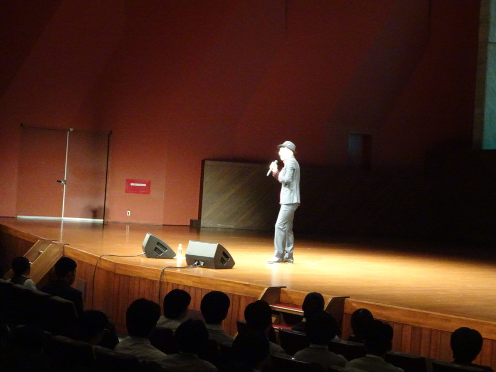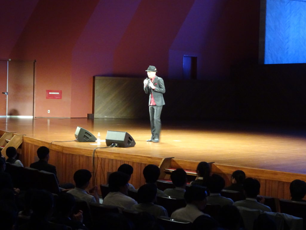 その歌声の主は、「千鳥の鬼レンチャン」で一躍有名となった歌手の「木山裕策」さんでした。県立劇場コンサートホールで、慶誠高の生徒一人一人にその思いが伝わるよう全力で歌い、そして全力で語っていただきました。