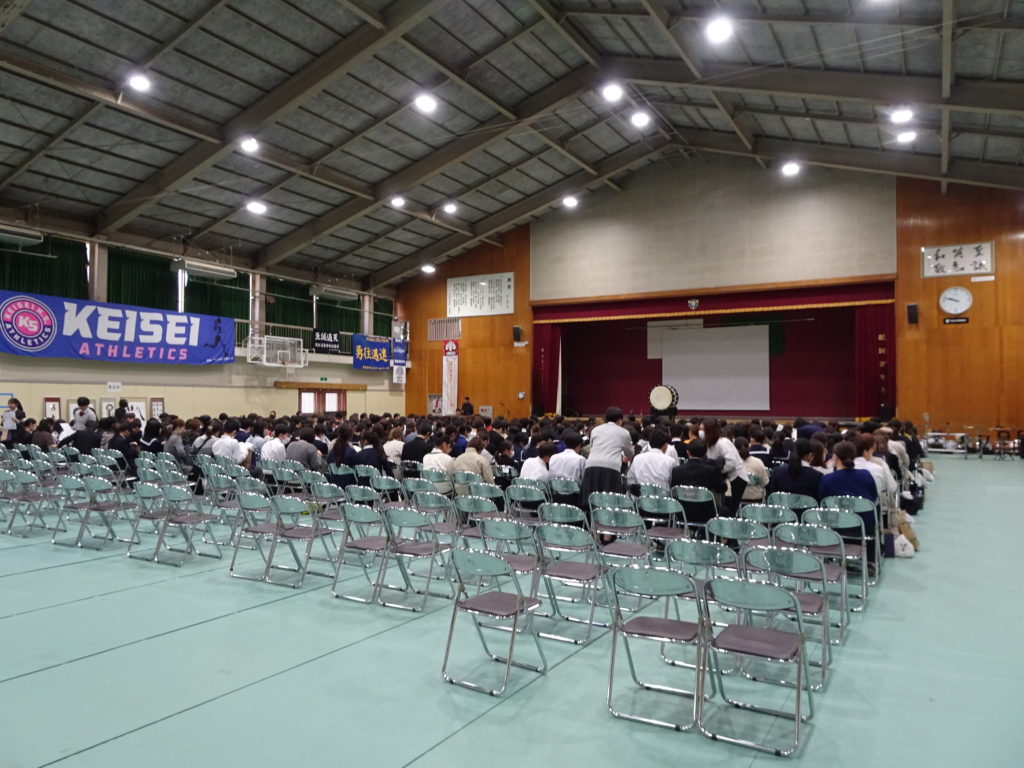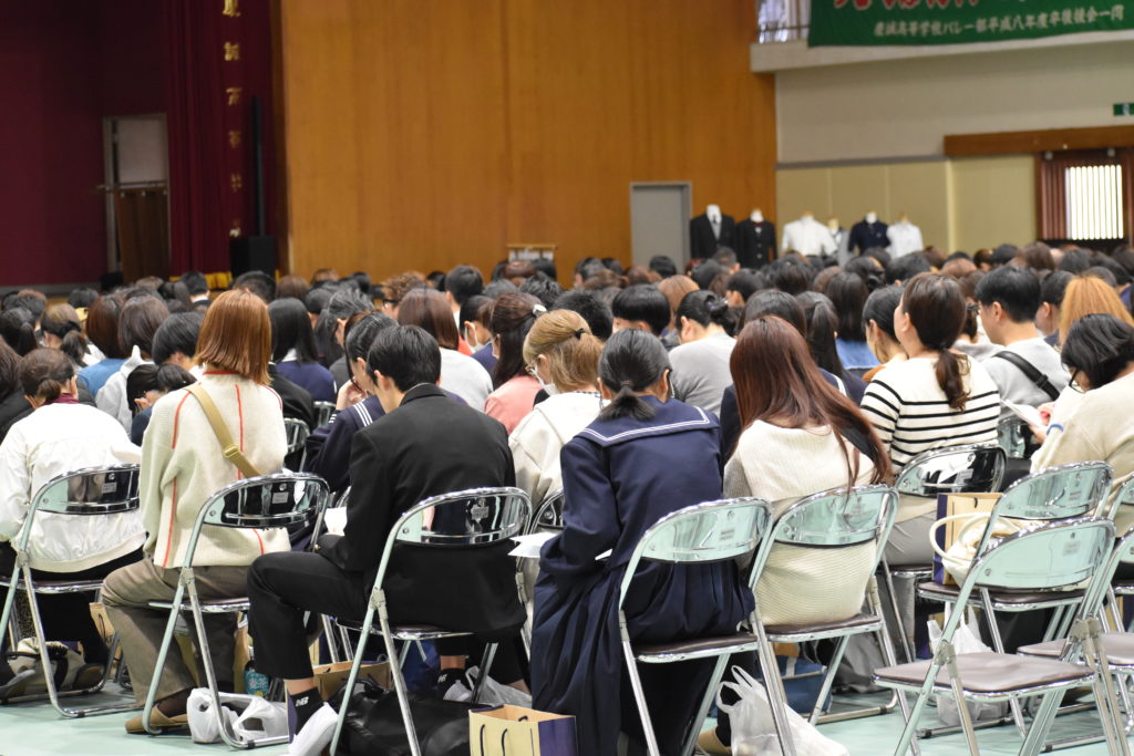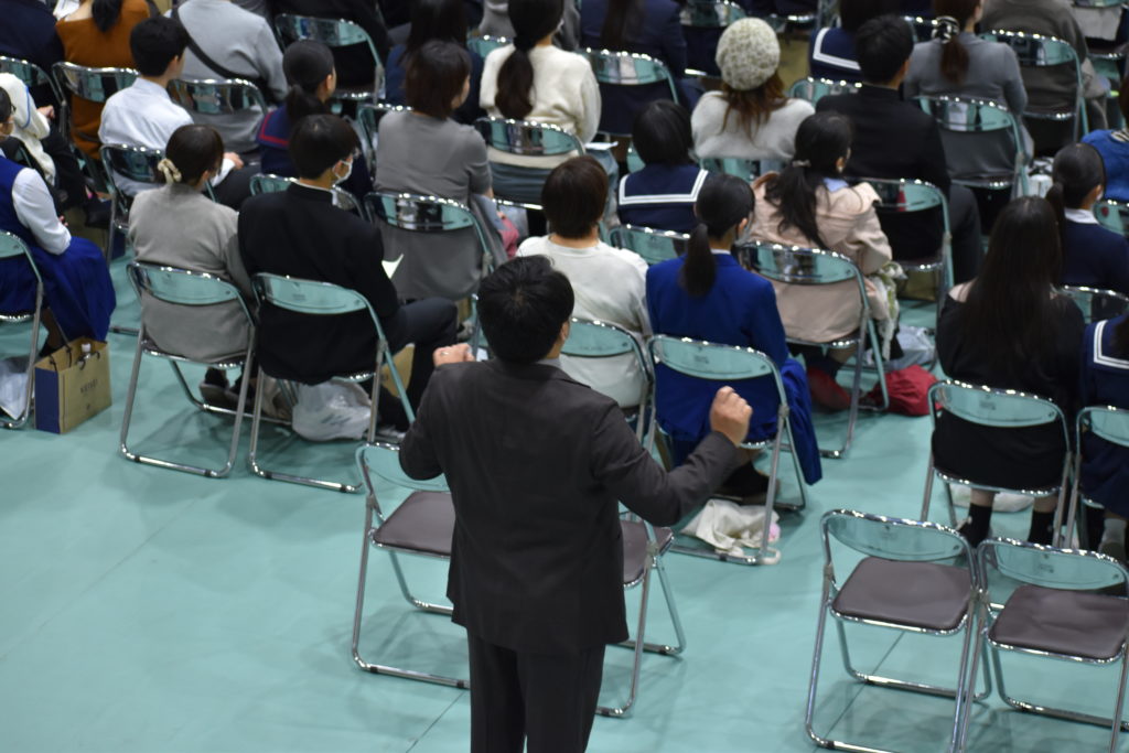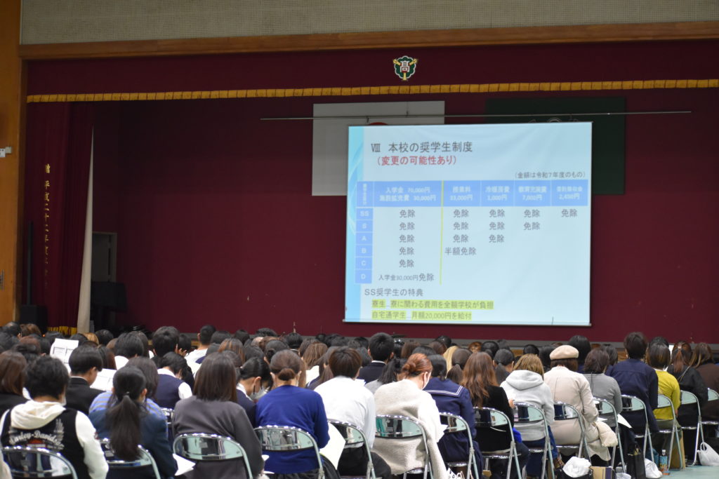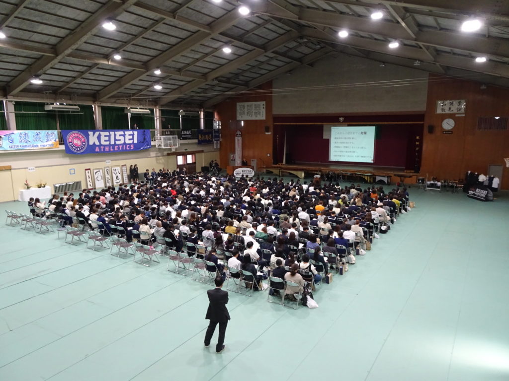 これが、生徒一人一人が慶誠高の広告塔になった証!」・・・昨年度より30%も参加者が増えた体育館会場です。参加した中学生はもちろんですが、保護者の方々も真剣な眼差しで、話を聞かれ、必要に応じてメモを取られていました。準備した椅子が埋まるほどの参加者です。