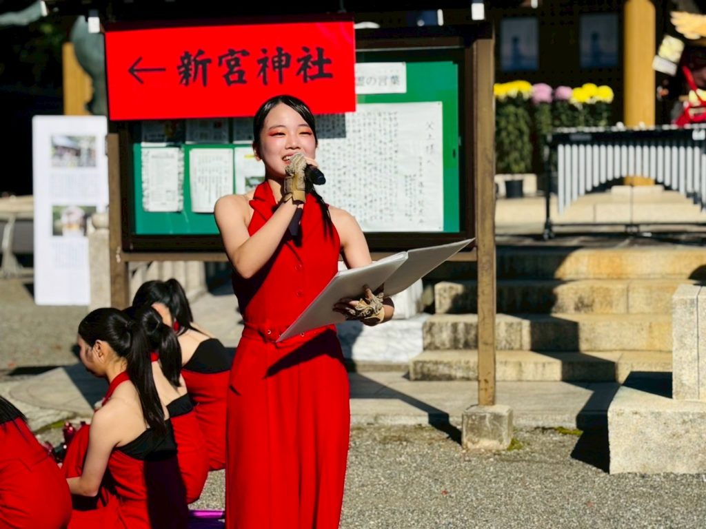 秋も深まり・・・もう冬です!」・・・熊本市の伝統芸能である新町獅子保存会による獅子舞も舞う中に、「いらっしゃいませ~っ!」とパティシエコースの生徒の声が響きます。そして、いつもの慶誠サウンド軽快に爽やかな秋空に響き渡りましたっ!