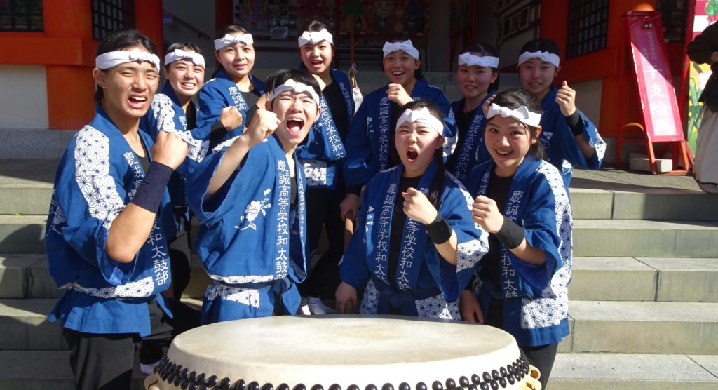 みんなで、よっしゃ~ぁっ!」・・・演奏後に「やり切った感めいっぱいで撮った得意のガッツポーズです。隣のステージで次のイベントが始まっていたので、エアよっしゃ~ぁっ!をした頼もしき和太鼓部の部員たちです。今日は、14名中10名が参加。限られたメンバーだったからこそ、全力で慶誠和太鼓の魅力を届けましたっ!