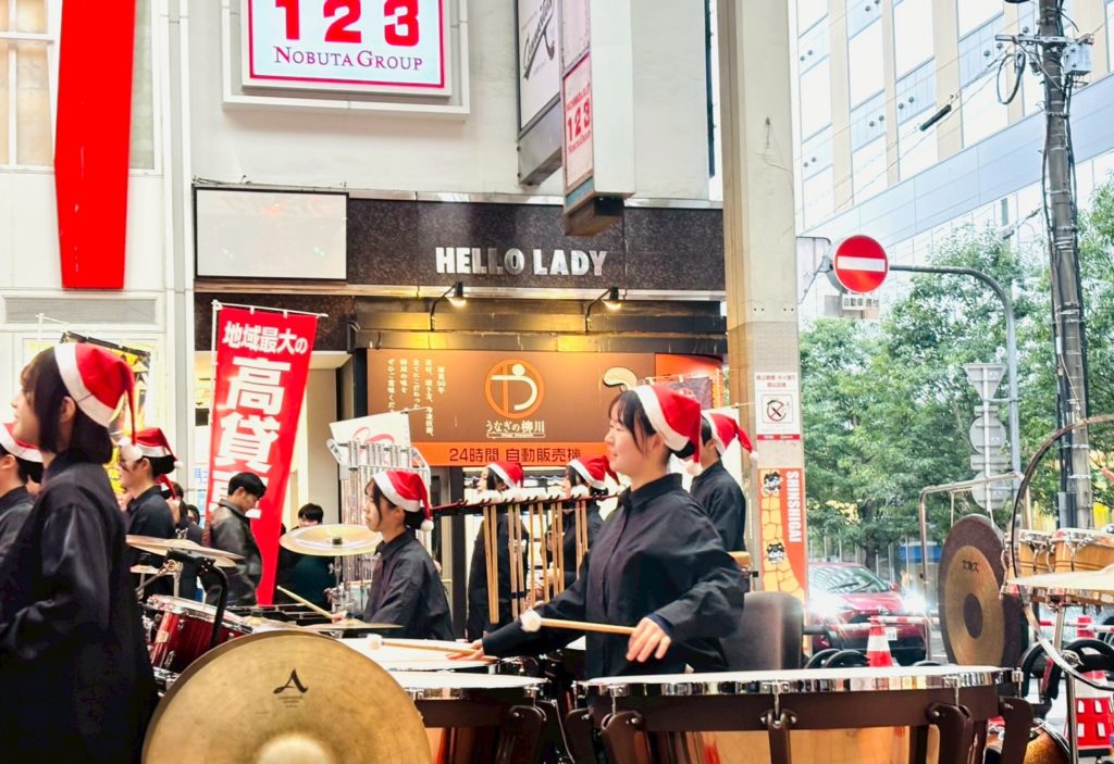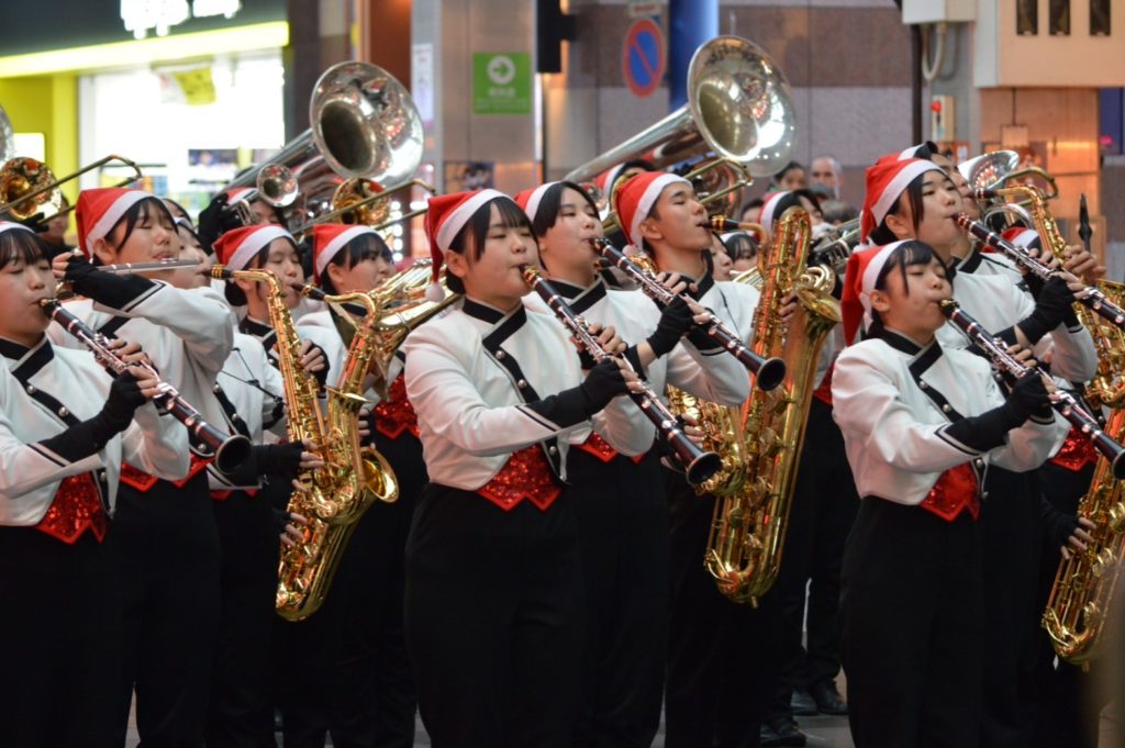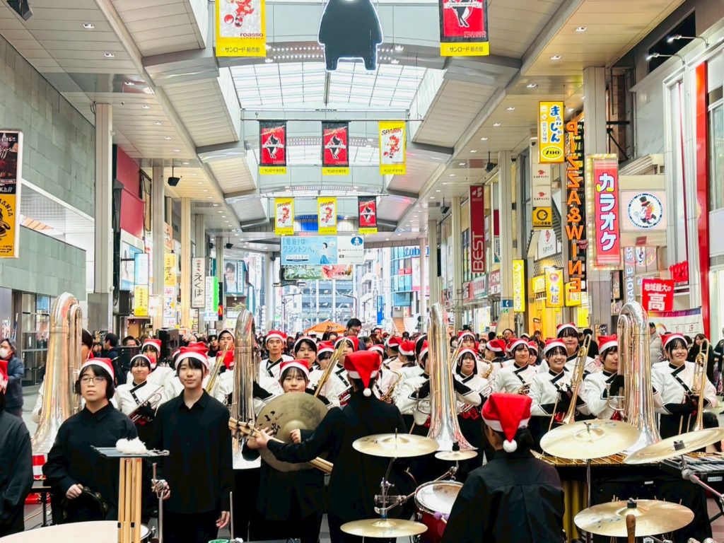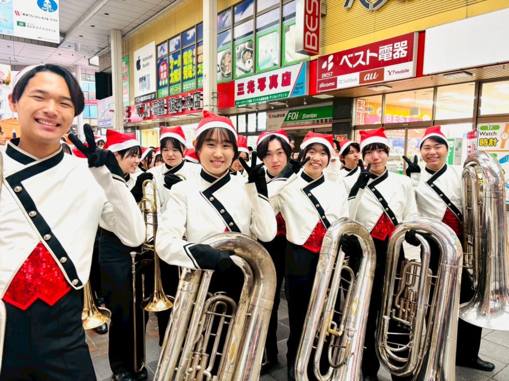 「高校生まちなかクリスマスコンサート開幕っ!」・・・2018(平成30)年から始まって今年で7回目。熊本中央高校、熊本国府高校、そして慶誠高校の吹奏楽部員、総勢約135人が集って、全力で楽器を奏で、ダンスを披露しました。