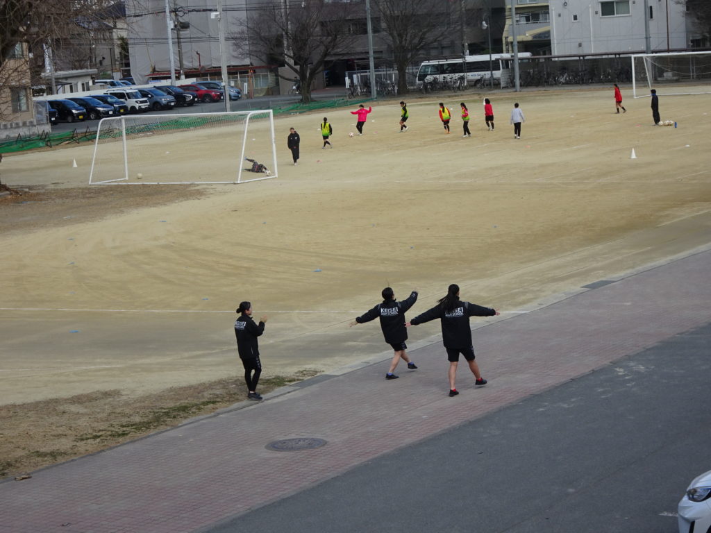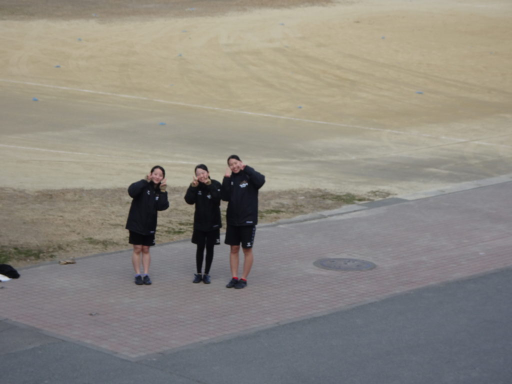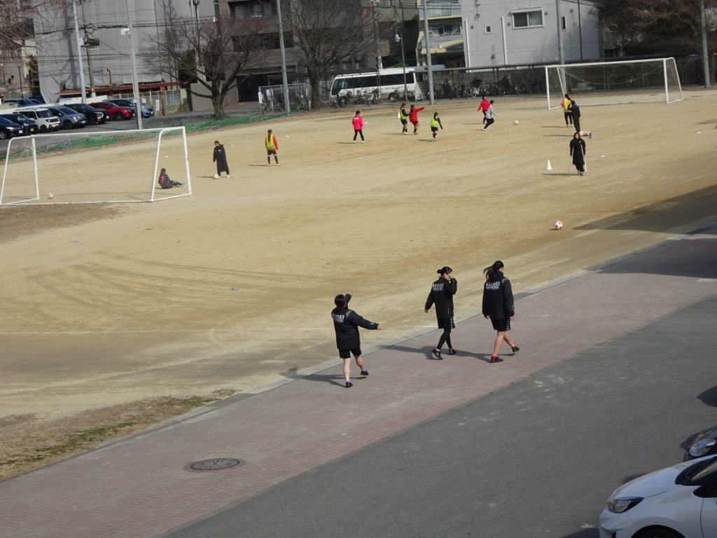 デジカメを急いで取りにもどり、改めて撮ったショットがこれです。カラーガードの基礎練習をする吹奏楽部員の向こうには、藤井先生と一緒に青春真っ只中の女ッカーが全力練習中でしたっ!