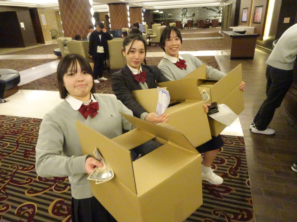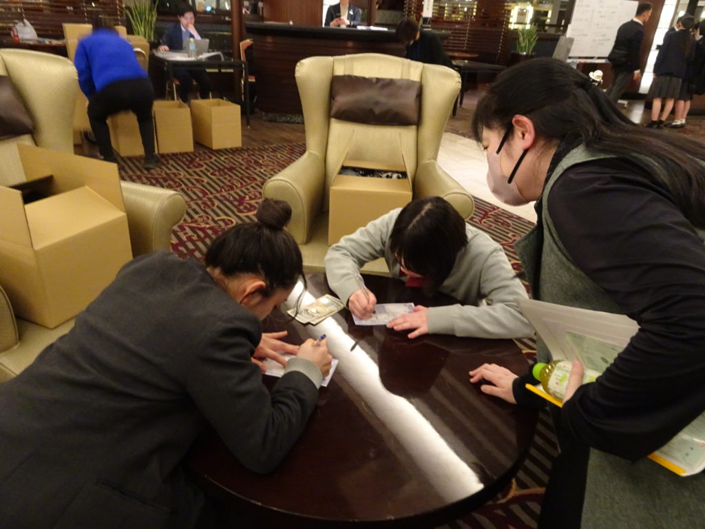 到着後、すぐに両手いっぱいのお土産を段ボールに詰めて、郵送の準備をする生徒たちもいました。