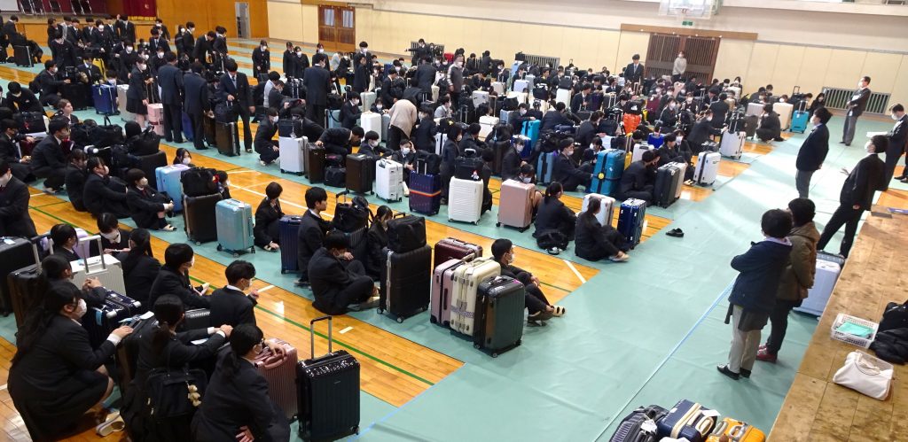 「いざ、積込み・・・」・・・1時間目にキャリアケースを積み込んで、ひと足先に荷物が修学旅行へ向かいました。一人一人、本当に生き生きしています。来週の今日、心のキャリアケースに素敵な思い出いっぱいつめて帰って来る2年生の表情をすでに想像しています。今日の2年生の予定は、2~4時間目は通常授業、5時間目に結団式、6時間目に修学旅行に向けてのLHRです。