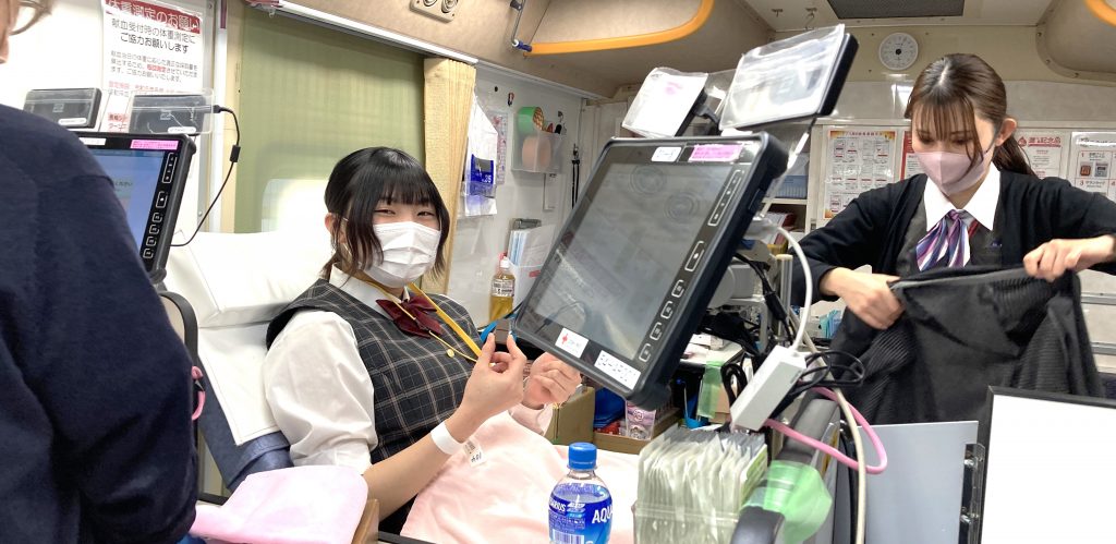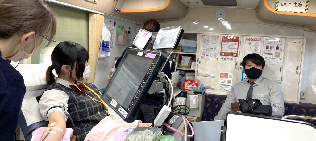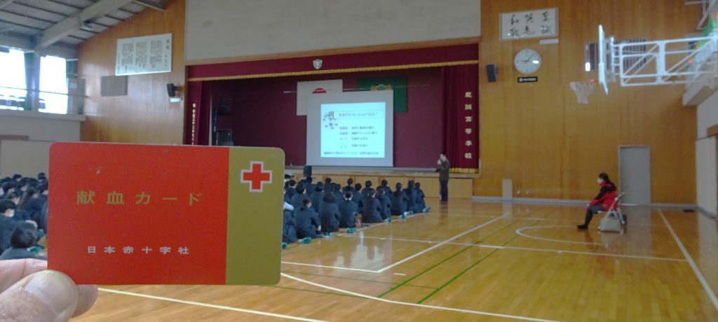 献血は命のバトン」・・・このショットは、1/22(月)の1時間目の「献血セミナー」の様子です。日赤から講師を招聘してのセミナーです。卒業を前にした3年生対象です。献血は、男子が17歳、女子が18歳から行うことが出来ます。献血の必要性について、動画や講師の先生の話を通して学びを深めた3年生でした。そして、今日です。