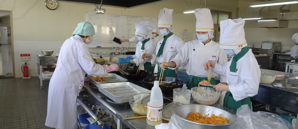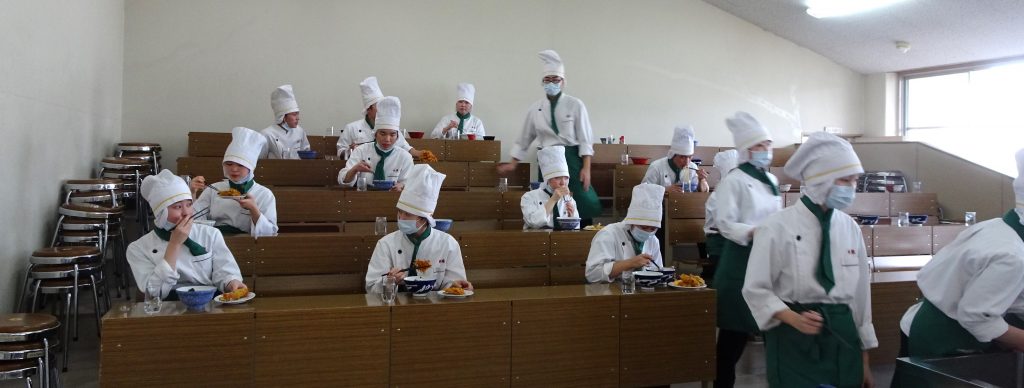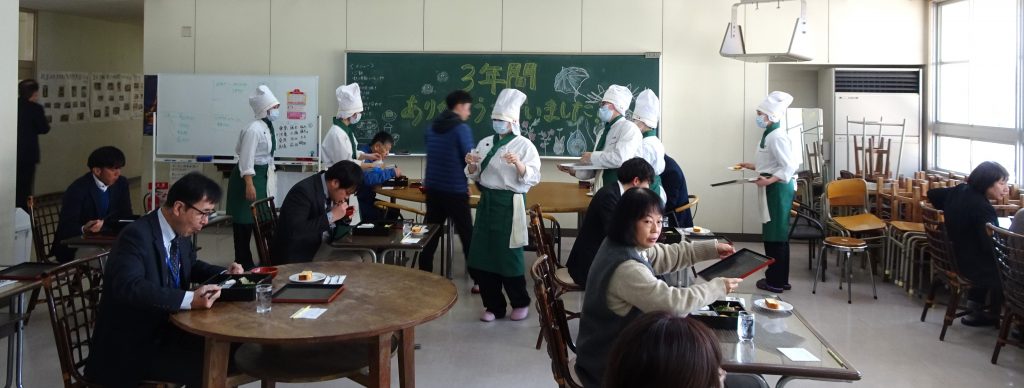 3年10組パティシエコース同様、3年1組食物科も最後の実習が「集団給食」でした。3年間の集大成です。集団給食として出されたのは、「松花堂(しょうかどう)弁当」です。