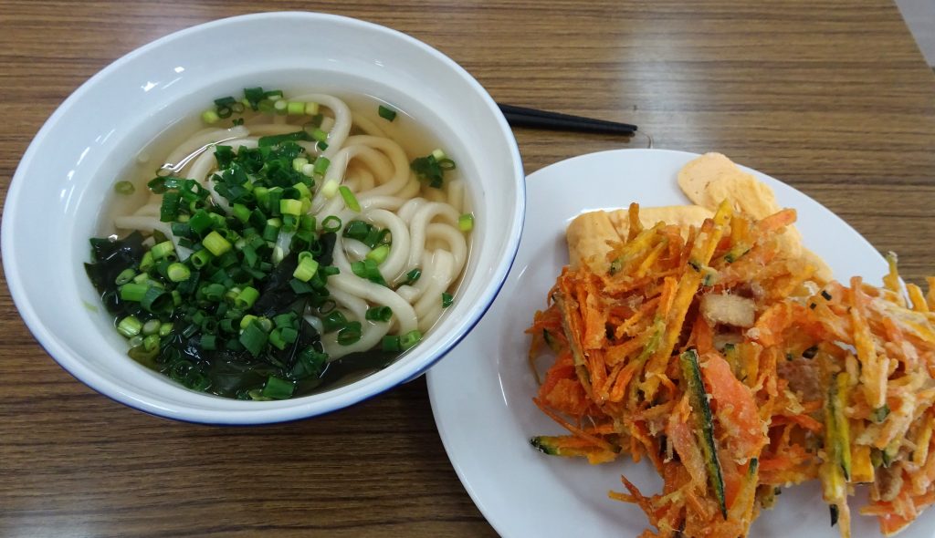 これは・・・?!」・・・かき揚げとうどん、これが慶誠っ子たちの「まかない」です。先生方の食事が終わったあと、慶誠っ子たちがとった昼食です。慶誠っ子たち力うどんです!
