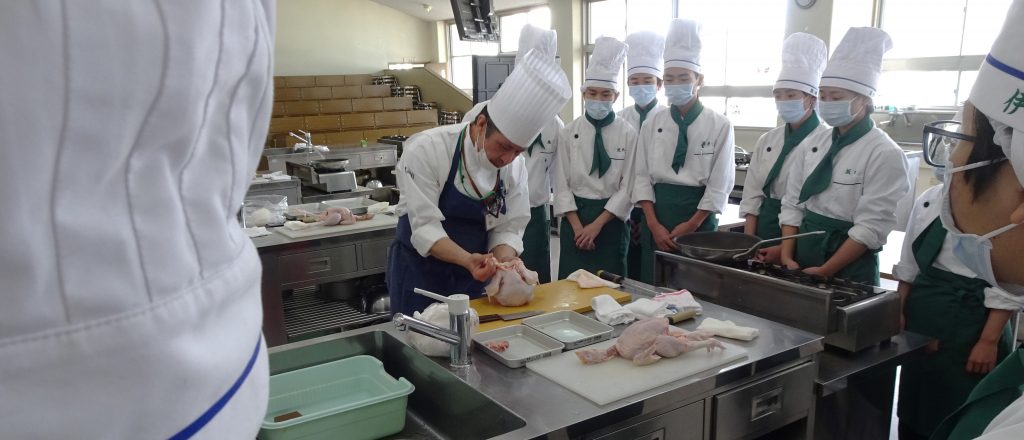 3月6日(水)の3、4時間目、食物科1年1組の慶誠っ子たちが、食物科ならではの学びをやってのけました。それは、鶏をさばくことです。