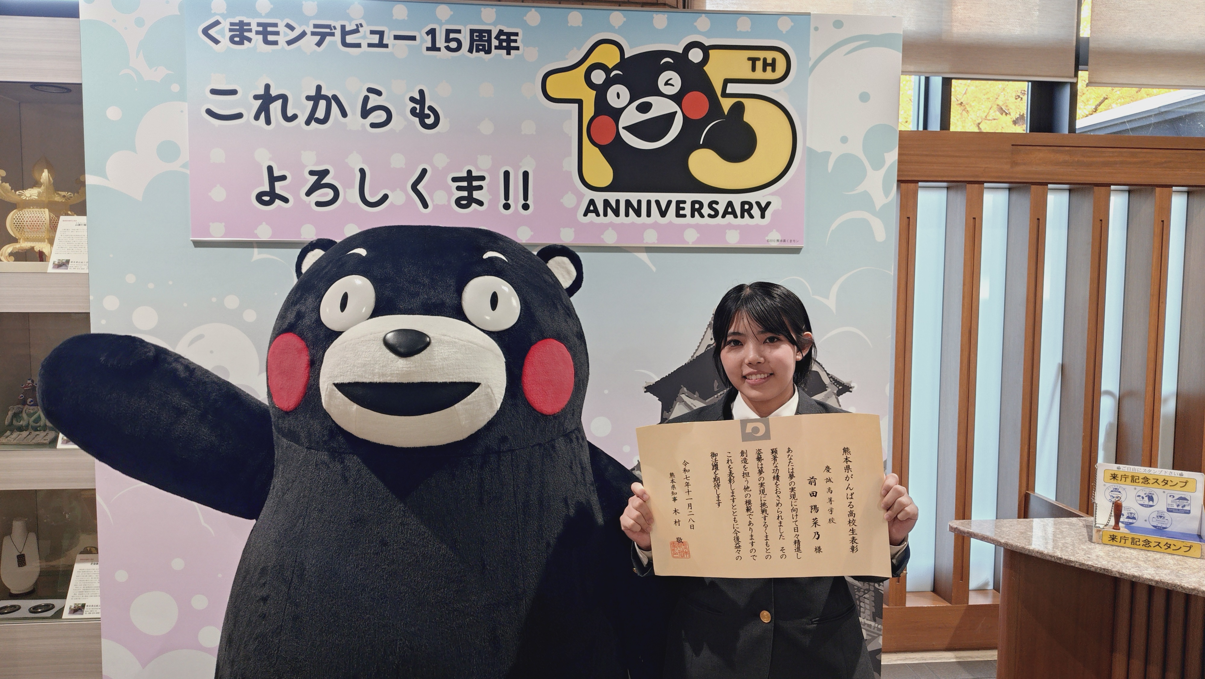 11月28日(金)、熊本県庁にて「令和7年度 熊本県がんばる高校生表彰」が厳かな雰囲気の中で執り行われました。この表彰は、学習活動・部活動など、日頃から努力を積み重ね、周囲の模範となる高校生を称えるものです。 本校からは、3年4組の 前田陽菜乃さん が代表として選出されました。 学校生活の中で見せる学習への真摯な姿勢に加え、クラス活動や卓球部員として前向きに取り組む姿勢など、日々の継続した努力が高…続きを読む